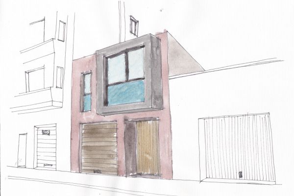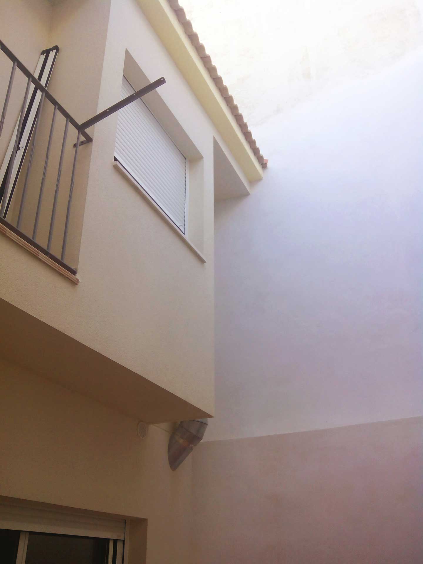 Vivienda unifamiliar en planta primera con garaje y bodega en planta baja. Se utiliza un sistema convencional de fachada de doble hoja de ladrillo caravista y revoco de mortero monocapa. La cubierta a dos aguas permite la ejecución de un patio tipo "pluvium romano".